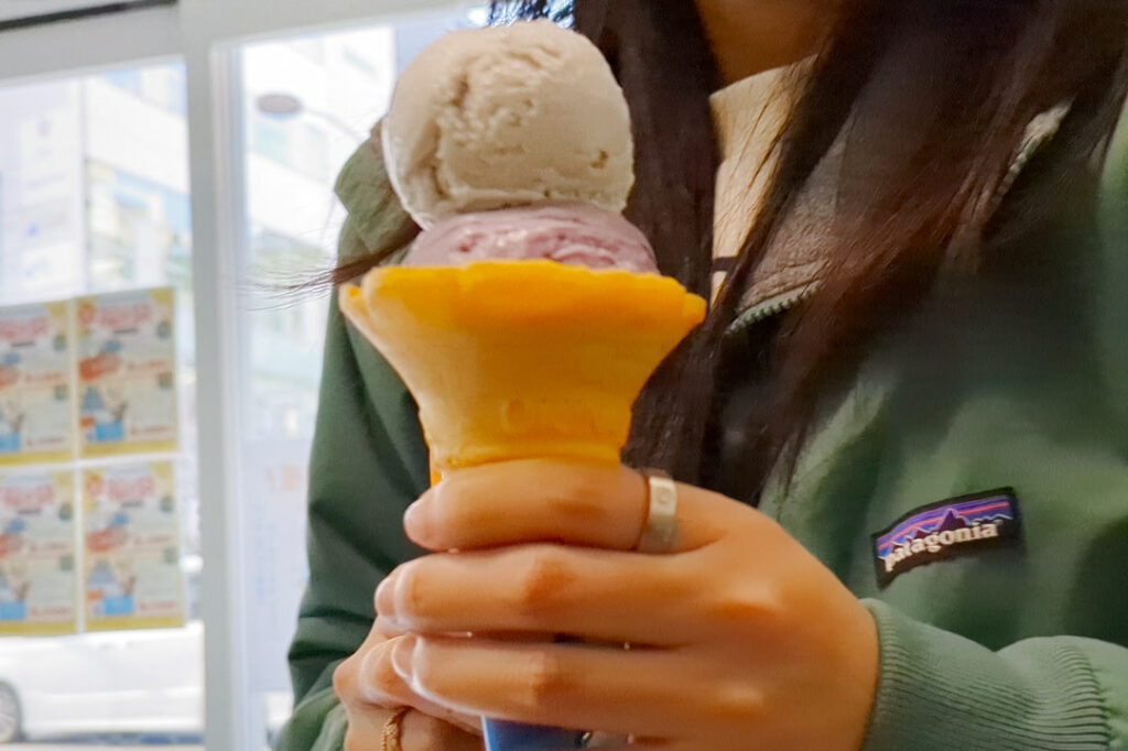 아이스크림 싱글 레귤러(자색마, 오키나와토란치즈케익) – \400
